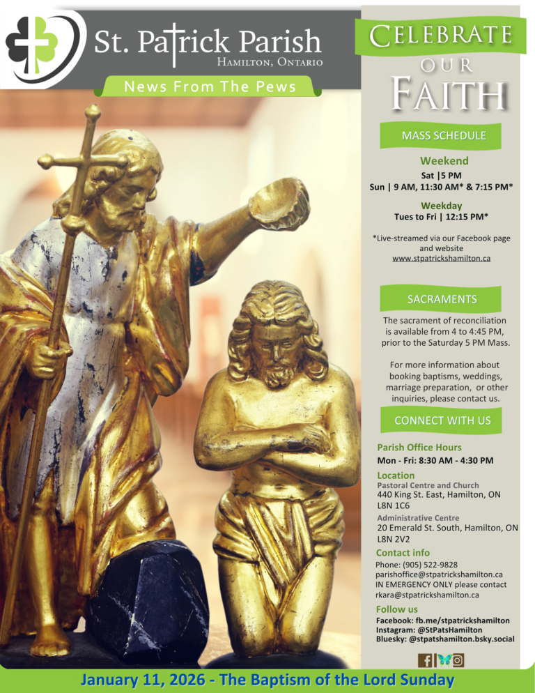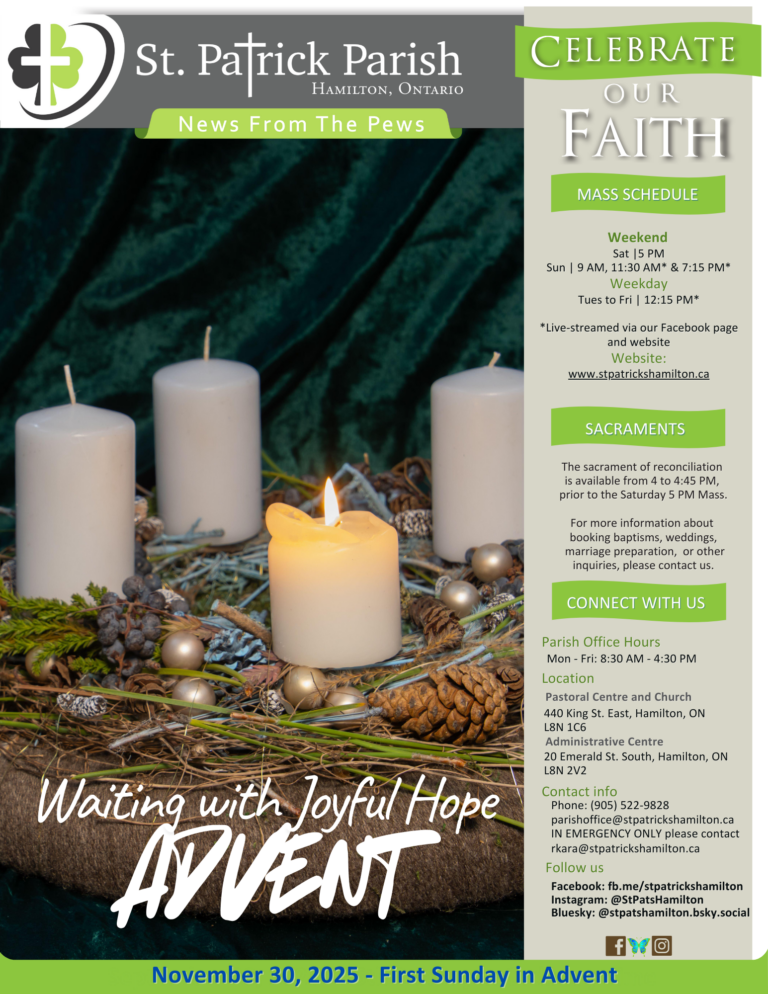 Each week, with the exception of the summer months, we produce our bulletin, “News from the Pews”. If you want to know what happens at St. Patrick, check out our bulletin, filled with pictures and stories about our parish. We encourage you to drop us a line at hello@stpatrickshamilton.ca, to let us know how your visit to St. Patrick was. Let us know if you have some suggestions for us, or if you would like to suggest a story about life “Beyond The Walls” to include in a future edition. We’d love to hear from you!